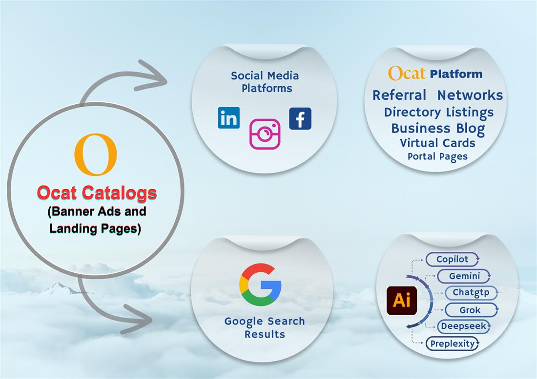 Multiple Banner Ads and Landing Pages will be created in an Online Catalog which will be distributed through Search engines, Social Media, Referral Networks, Ocat Advertising Sites and Ocat Marketing Portals.